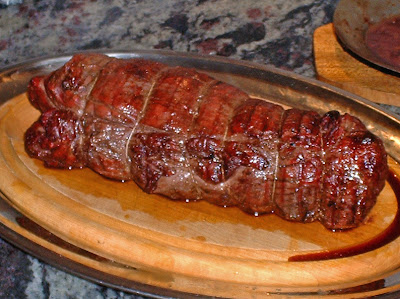 This meat was removed at an internal temperature of 125F for medium rare beef. This usually takes 45 minutes to one hour including searing time. The roast should be left to rest under foil for fifteen minutes, then removed to a cutting board. The drippings left behind in the grill pan are spooned over the meat when served. There is enough flavor in the drippings that salt and pepper are usually not needed.